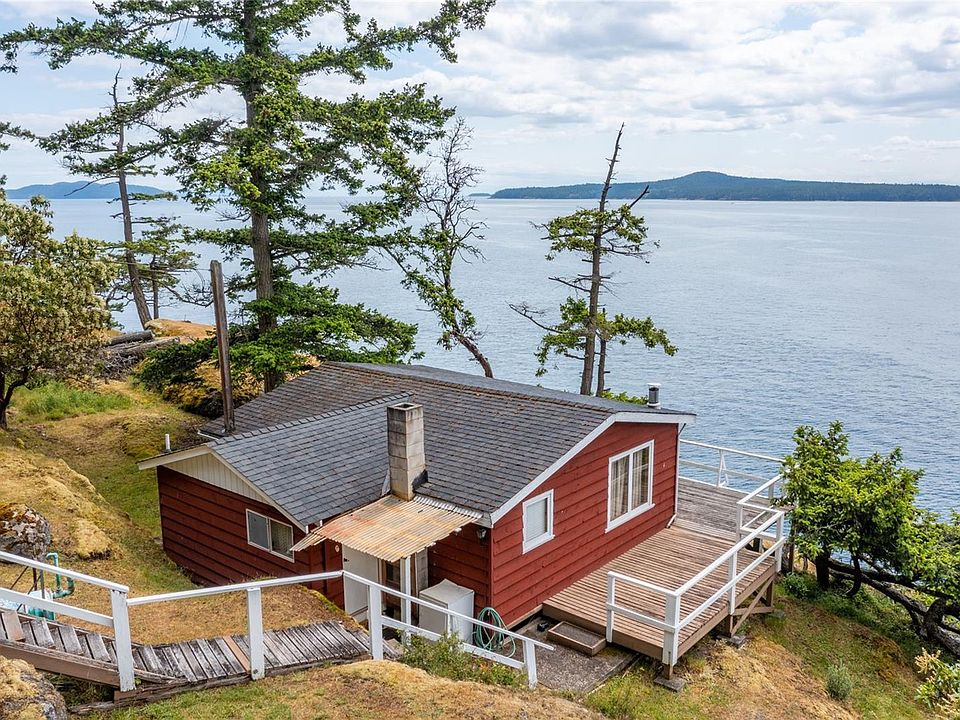 Tucked away on the beloved Pender bluffs, over a charming rock wall, lies this one-of-a-kind cabin. Nestled on the property in a way that makes it feel like you're in the heart of a park. Perched above the ocean, prepare to enjoy passing whales, boats, and sunsets every evening. This is a place where nature speaks and time slows down. The cabin itself invites you to embrace rustic island living. The footprint is rare and instantly recognizable for its potential. If homes could tell stories, this one would be filled with decades of family memories, dating back to the 1960s—of children exploring the bluffs and families gathering year after year. Owners in Magic Lake enjoy access to the marina and tennis courts. Come see what makes Penderosa such a special place and start making your own memories. Measurements approx.