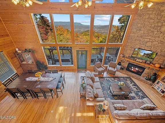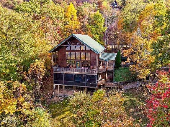 RENTAL INCOME OF $177,702 10/23-09/2024 and $215,076 in 2023. Explore this mountain estate nestled in Wears Valley, set on a private, gated 0.78 acres with breathtaking views of the Great Smoky Mountains. Currently operated as a 6-bedroom, 6.5-bath mountain retreat. This property (~3370 sq.ft) features a main cabin with 5 Bedrooms and 5.5 baths, along with a game room. The 6th bedroom is a detached private suite that includes a spacious theater room downstairs (~ 1352 sq.ft). As you enter the open-concept living area, you'll be captivated by the abundance of natural light and a wall of glass windows that frame the spectacular mountain vistas. The interior boasts gleaming hardwood floors and a grand 30-foot stone fireplace, creating an impressive atmosphere for gatherings. The gourmet kitchen is featuring modern appliances, granite countertops, and a large island perfect for entertaining. On the main floor, you'll find a luxurious KING SIZE SUITE with its own private bathroom, as well as a convenient half bath. Upstairs, two additional KING SIZE SUITES offer mountain views. The lower level is designed for fun, featuring a game room equipped with a pool table, game table, and arcade games, plus two more bedrooms: a 4th KING SIZE SUITE and a 5TH BEDROOM with bunk beds. The DETACHED KING SIZE STUDIO APPARTMENT is an ideal retreat, complete with its own bathroom, living area with a sleeper sofa, kitchenette, and private balcony—perfect for those seeking extra privacy. Additionally, the suite boasts a spacious theater room for cozy movie nights. Outdoors, the property offers a lovely lawn with a playground and fire pit for outdoor fun. Relax on one of the two decks: the screened-in lower deck features a bubbling hot tub and seating area overlooking the mountains, while the covered upper deck is perfect for outdoor dining. Situated 2,400 feet above sea level in the Millers Creek community at the foot of Cove Mountain, this retreat is conveniently located just ~20 minutes from the main Parkway in Pigeon Forge and ~13 minutes from the entrance to Great Smoky Mountain National Park via Line Springs Road. Enjoy the ease of paved roads leading directly to the property. Owners keep property maintained: * new screened in porch and railings for the bottom deck at the main cabins, outside firepit area added, decks and stairs stained in 2023, new water heater in 2023, previous repairs included replacing HVAC, water filtration system, adding a movie theater, adding a kitchenette in studio style bedroom, replaced appliances, furniture, cabin stained, interior renovations etc.** drone photography was used.
