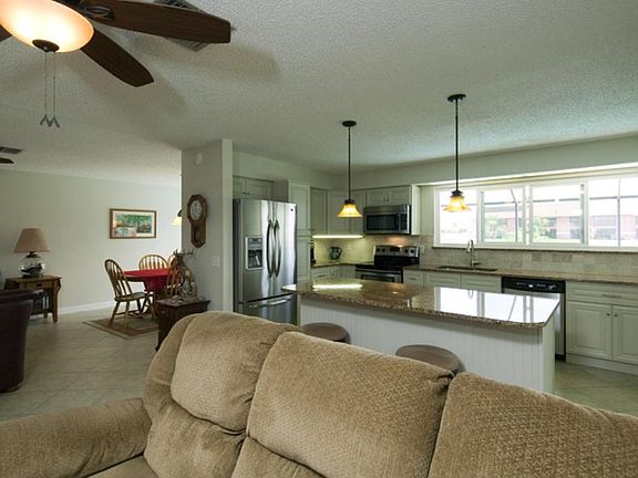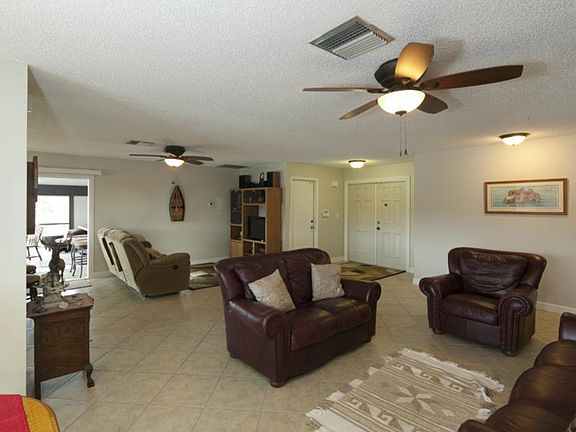 Watch the boats go by! This home sits on a large canal with 120 ft of canal frontage. The yard has an irrigation system & mature landscaping on an oversized lot. When you enter you will see an open floor plan with a Dining Rm, Kitchen & large Great Rm. All updates, diagonal tile floors throughout. New Kitchen with granite counter tops. In 2011 all new windows, sliders, HVAC, appliances and water softener. The Dining Room & Great Room has a walkout to Lanai. The Master Bedroom also has a walkout and a Garden Bath with a walk in closet. Both baths have new vanities and updates. The heated salt water pool is 60'X20' and built in 2011. All new paver surround pool and lanai cage. Covered lanai is 20'X19' and the 20'X12" dock is also covered in pavers and has roughed in electric and water for a future lift. All widows and doors have electric shutters, covered lanai has manual shutters.