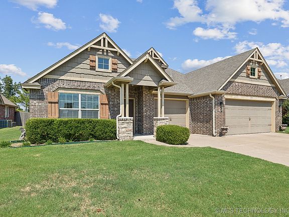 This immaculate, full brick home in Country Woods has over 2000 square feet of living space, 3 spacious bedrooms, 2 full bathrooms, and an office. The open-concept kitchen features an extra large walk-in pantry, stainless steel appliances, all of which will stay, including a new dishwasher and garbage disposal. You'll love the master suite with granite his-and-hers sinks, a large walk-in shower, and two spacious closets. Enjoy your morning coffee on the extended patio in the backyard, enclosed by a brand-new privacy fence. This home also includes a 3-car garage with a storm shelter. The neighborhood offers walking trails, a pool, parks and a splash pad! Location is everything, easy access to Hwy 75, less than 10 minutes to Tulsa Hills shopping and restaurants. Don't miss out on this perfect combination of luxury, convenience, and community!