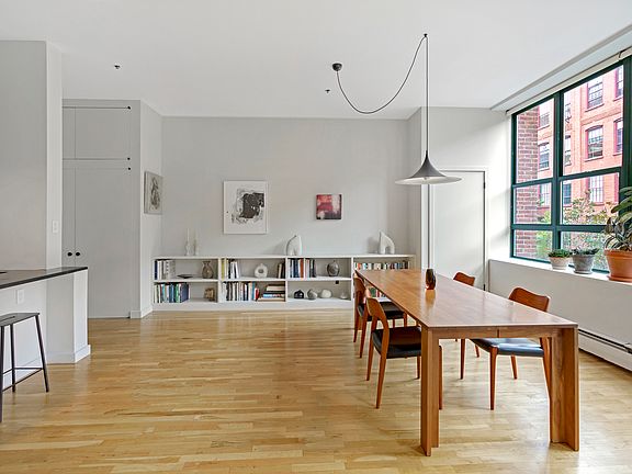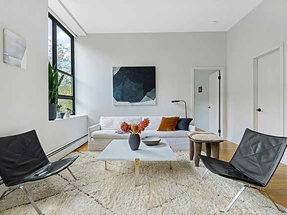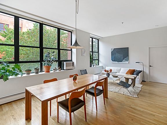 Apartment 3A at Clinton Mews is an expansive, convertible 2 bed, 2 bath classic loft with 10.5 feet ceilings, and a wall of oversized windows overlooking treetops that bloom abundantly in the Spring. The open living and dining area can easily accommodate a true 2nd bedroom with an adjoining bath. The unique and striking kitchen has been fully renovated and includes a raised ceiling, soapstone countertops and backsplash, counter seating, sandstone tile flooring, and Bosch appliances. The massive adjoining laundry room/pantry features a brand new washer and dryer, as well as a raised ceiling and custom shelving for extra storage space. The spacious master bedroom features a floor to ceiling walk-in closet built-out with shelving and an en-suite bathroom. The two full baths have been upgraded with new vanities, lighting, and inset medicine cabinets. The entire space has been transformed with unparalleled attention to detail. Built-in bookshelves in the main room, molding and window sills have also been replaced with a modern look and painted with custom low VOC paint by Farrow and Ball. Located in the heart of Clinton Hill, the pet-friendly Clinton Mews was converted from a pre-war shoe factory to 78 thoughtfully designed residential lofts in 1987. Across the street, the lush campus and sculpture gardens at the Pratt Institute welcome you year-round. The building includes brand new elevators, on-site security, secure parking, bike storage, a landscaped courtyard, a live-in superintendent, and two full-time porters. The building will also be installing all-new custom windows in 2021, with no additional assessment. Parking is available for $177 per month, (immediate openings available.) All this and a flexible sublet policy makes Clinton Mews one of the most appealing residences in the area. Fort Greene Park with its popular Saturday Farmer's Market is just up the street, while a number of world-class cultural destinations including BAM, Barclays Center and City Point BKLYN surround this historic community. A culinary destination for all, Miss Ada, Walter's, Olea, Aita, The Finch, Emily, Roman's, Choice Market, Mekelburgs, Speedy Romeo, and many more are also just around the corner. Enjoy a short walk to the G and A/C train lines for a 15-minute ride to Downtown Manhattan or 30 minutes to Midtown. In addition, the B38 bus to the B/Q/R lines and City Point BKLYN is conveniently located across the street.