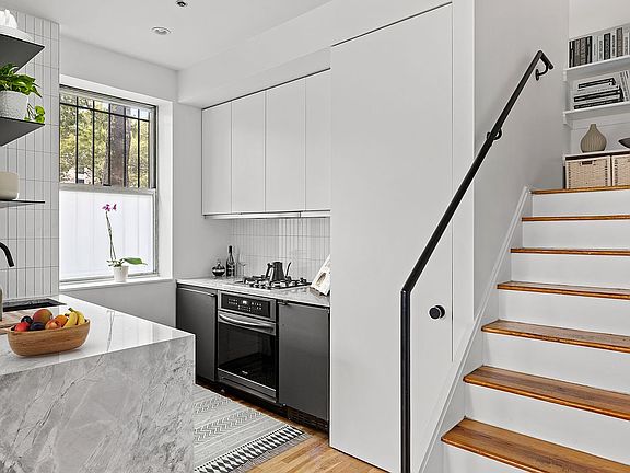 Private entrance into the first floor open concept living/dining area with high ceilings and an oversized wall of windows. The beautifully renovated, windowed kitchen is highlighted by the marbled quartz breakfast bar, custom cabinetry and complete with new appliances, including Bosh dishwasher. The first floor half bath has also been fully renovated and includes a separate laundry area with additional storage and Miele washer/dryer.
