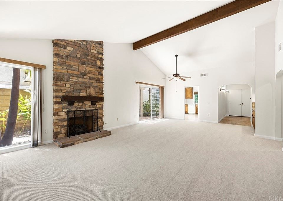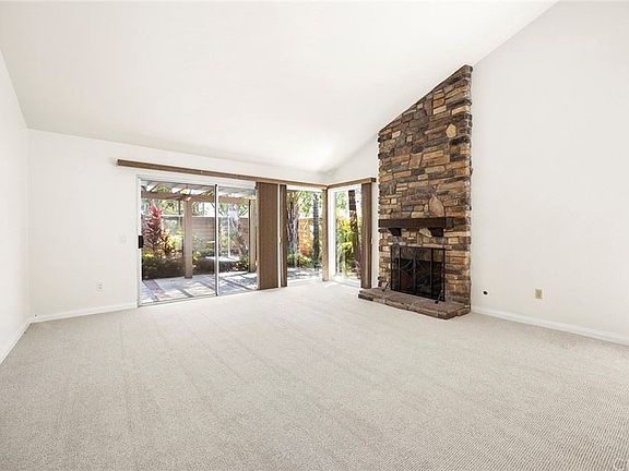 Privacy and single-story living awaits in this adorable two-bedroom home situated in the secluded gated community of Granada Park with lush tropical landscaping that welcomes you home each day. As you step through the double door entry, you are greeted by the handsome travertine flooring, and the light and bright interior boasting fresh neutral toned paint and brand new carpeting, sure to impress the most discriminating buyer. Soaring ceilings are the focal point in this oversized great room, with a floor to ceiling stone-finished warming fireplace and convenient wet bar with glass front cabinetry. Multiple sliders flood the rooms with natural light, and open to invite you outdoors to relax on either the sun-filtered paver patio off the dining room, or a second covered patio across the back of the home. The spacious kitchen enjoys a large window above the sink, plentiful meal prep counter space plus a full complement of appliances. A casual dining niche is treated to the tropical landscaped views through the pretty picture window, creating an ideal spot to enjoy your morning cup of coffee. The expansive primary suite is accented by soaring ceilings, large view window, cooling ceiling fan, and a fully outfitted bathroom with dual granite vanity, sumptuous soaking tub, custom framed mirrors, and a surprisingly ample walk-in closet. The second bedroom is also good sized with a mirrored wardrobe closet. The second bath has been updated with a pretty vessel sink and separate shower. This open floor plan is ideal for entertaining, just open the sliding doors and let the cool breeze in as guests meander inside and out expanding the usability and versatility of this open floorplan and space. Low maintenance Alumawood patio covers, no maintenance turf, swaying palm trees, plus an outdoor TV creates the ideal secluded outdoor atmosphere. Garaging for two cars in the detached garage with convenient laundry service that includes the washer and dryer. Desirable association amenities include sparkling pool and relaxing spa, energetic tennis courts, fun club house for resident's use, and meandering walkways throughout the gated neighborhood. Commuter friendly location with lots of restaurants and shopping just a short drive away. This appealing property is ready to be enjoyed!