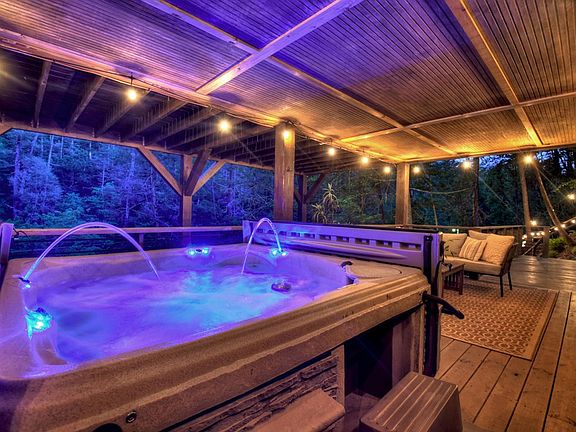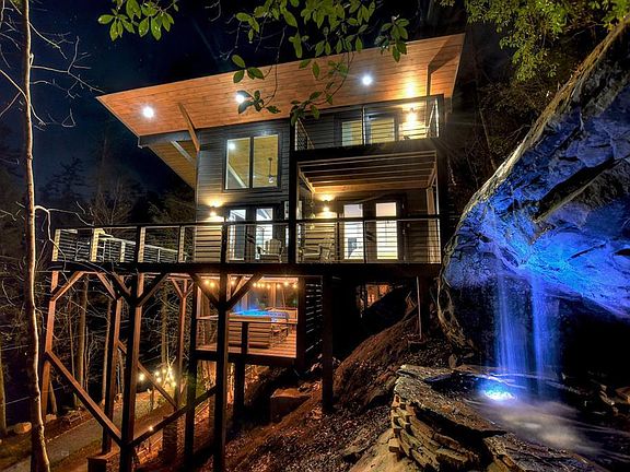 ^Modern Treehouse^ on the ~Toccoa River~Whoever said “don't go chasin' waterfalls” was seriously mistaken! This exquisite modern rustic retreat is the ultimate definition of one-of-a-kind built right into the side of the mountain with a waterfall literally at your back door. From the moment you arrive, the attention to detail cannot be overlooked. “River Rock on Toccoa” was designed as a modern treehouse tucked away in the heart of the Aska Adventure Area overlooking its 300' of rushing Toccoa River Frontage & boasting gorgeous mtn & river views. Blue Ridge's best kept secret is located just 8 miles from downtown and within walking distance to the Aska Trail System! Outdoors you'll, of course, enjoy the amazing river frontage with picnic area and firepit, moving up the mountain, you'll enjoy plenty of deck space – covered hot tub porch (w/ unique cover AND its own sitting area and TV), the main level deck wraps around from the front of the home accessed from the great room around to the primary bedroom & outdoor shower built right into the rock! There is even a private balcony on the waterfall side just off the 2nd BR/large open loft upstairs. Moving indoors, you'll feel right at home with the warmth you feel upon arrival. The interior is spacious yet cozy. It offers a great blend of finishes with drywall, wood, stone, and tile. The main level offers an open kitchen & living room with soaring ceilings and sliding glass doors to the deck overlooking the river. The great room offers a fireplace that leads the eye to the upper level loft accessed via stylish spiral staircase. The kitchen offers stainless appliances, floating shelves and plenty of cabinet space along with an island that boasts its own live edge bar! The trendy bathroom offers a tile shower with waterfall showerhead, and the primary bedroom is just around the corner with its own fireplace! This home is a 5 star rental - it is in AIRBNB's top 1% of homes rented 95% of the time and is available turn-key.