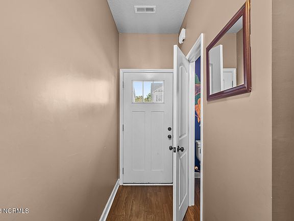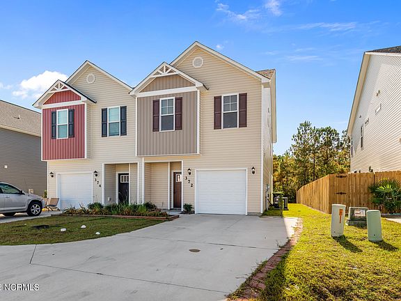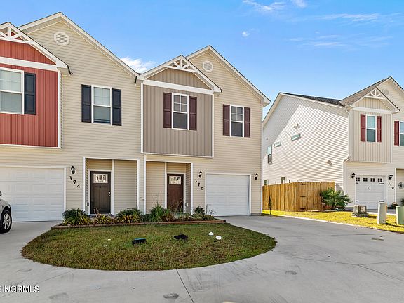 Welcome to 372 Frisco Way! This cozy 3 Bedroom 2.5 Bath townhome is situated in the town of Holly Ridge. Just 10 minutes away from the Camp Lejeune Sneads Ferry Gate. Upon entering you are greeted with a large half bath with pedestal sink. Moving down the entry way you will find an open floor plan complete with a breakfast nook and bar. The kitchen features all stainless steel appliances and a pantry/storage closet! Just off the living area is a glass sliding door that leads to a nice size yard, fenced in with a covered patio! On the second floor, you will find a conveniently located laundry nook at the top of the stairs! Moving down the hall you will find a full size spare bathroom, two spare rooms and two storage closets as well as the primary suite. The primary suite includes a large walk-in closet and en suite bathroom, providing dual vanities, a linen closet and a stand up shower! This property will not last long, schedule your showing today!