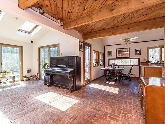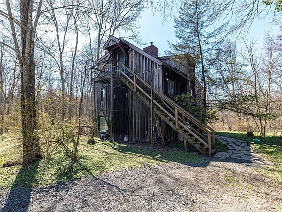 Serene, peaceful retreat on over 14 private acres in esteemed Tinicum Township! Quiet seclusion awaits down this 1/4 mile driveway leading to this rustic, board and batten sided contemporary home! The open concept first floor is beautifully adorned by brick floors providing the perfect organic complement to the abundant natural light pouring through the large windows and sliding doors. Centrally located wood stove creates a welcoming place to cozy up during the chilly winter months. 1st floor also features a half bath and washer/dryer. Ascending the rough sawn looking stairs to the 2nd floor, you'll find three bedrooms with extra large full bath that could provide a truly calming oasis overlooking the rear acreage. The 3rd floor is accessed by the exterior stairs and could provide potential for separate efficiency living space for extended family or guests - or ideal space for a home workspace. Outside features an expansive deck to take a respite from the hustle and bustle of the days and enjoy the very best of nature that the abounding acreage provides! Located 90 minutes from NYC, 1 hour from Philadelphia yet also in Palisades School District, this could be a wonderful weekend retreat or year round homestead.