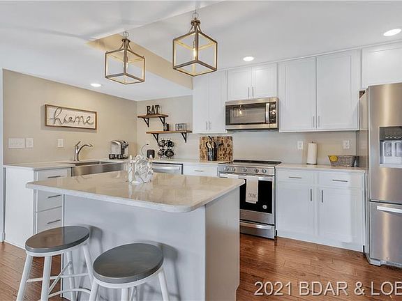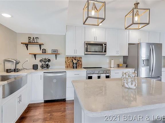 CHECKS ALL THE BOXES!! Located inside a cove with sweeping view to the main channel. Fully renovated in 2019, everything from floor to ceiling in this turn-key home is practically new. New Roofs 2021! A gorgeous kitchen with an abundance of cabinet space, ample pantry and large island is open to the lakeside dining and living room with new electric fireplace insert. With views from every angle and access to the expansive deck and patio, you are mere steps on a gentle lot from 100ft of lakefront and large 2 well dock. The master suite offers a private bath with walk-in shower, jetted tub, and walk-in closet. Upper level also includes 3 lakeview guest bedrooms: an en suite bedroom with private bath, and 2 additional bedrooms with shared third full bath, all providing access to the giant deck spanning the entire length of the home. Bonus space which could be a home office is currently used as 5th non-conforming bunkroom. Additional Storage room and 30X40 garage/ shop make this a keeper!