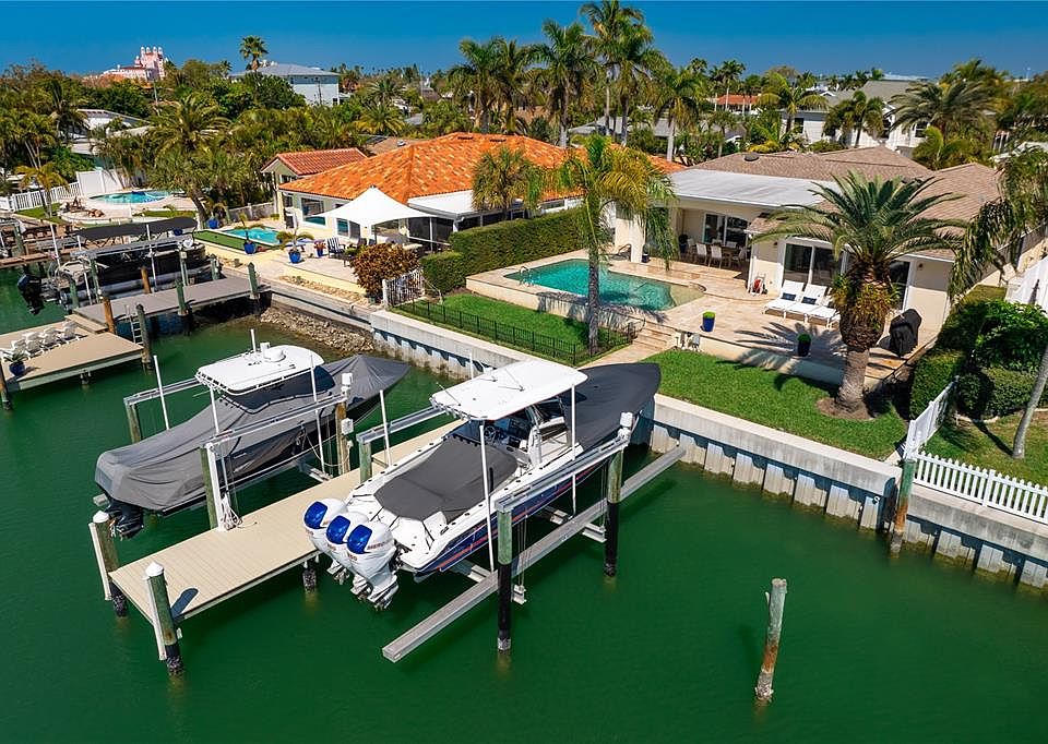 Luxurious coastal living in highly desirable Vina Del Mar Island and just steps to all the fun and activities Pass A Grille has to offer! Grand foyer entry with dramatic ceilings, graciously sized rooms and high-end finishes complement the overall experience this home provides. This home is often referred as the "House on the Hill" due to the high elevation, it should be coined "Perfection in Paradise" as the home is meticulously maintained! The fabulous triple split floor plan anchored by gorgeous marble and wood flooring create seamless livability. Whether you enjoy hosting intimate dinner parties or the next family reunion, this home is ready for you! The chefs dream kitchen features custom made Beritch USA cabinetry and kitchen island, quartz countertops and backsplash, state of the art finishes and appliances including built in Sub-Zero refrigerator, dual Wolf ovens and gas stove top with pot filler and Julien porcelain sinks. Master Suite includes volume ceilings, private access to the waterfront, walk in closet with custom shelving organization, separate water closet, walk-in shower and dual vanities. The 2nd bedroom is generously sized with ensuite and walk in closet. The 3rd bedroom has private access to bath and sliding glass doors to the exterior. Indoor laundry has an additional refrigerator, custom cabinetry with access to the garage. As fabulous as the inside living affords, the outdoors is truly exceptional along the deep wide waterfront canal. This is a boaters dream with dockage with a 20K lb and 12K lb boat lifts, refreshing and inviting pool, adjoining hot tub surrounded by an expansive travertine decking with plenty of outdoor patio space and covered dining area. Are you are a "cook your catch" off of the dock fishing enthusiast or an avid boater seeking easy access and no bridges to the Gulf of Mexico, this home is for you! This is the most unique property to hit the market, it's truly exceptional and is being offered completely furnished! Super easy walk, or take the bike or golf cart to the beach, charming shops and restaurants in Historic Pass A Grille. Easy access to vibrant Downtown St Petersburg to enjoy trendy restaurants, visit acclaimed museums or to catch a Rays or Rowdies game. Quick drive to Tampa Int'l or St Pete/Clearwater Airports, makes business or casual travel a breeze. Click on the Virtual Tour for more photos. Location, Location, Elevation on Vina Del Mar Island!