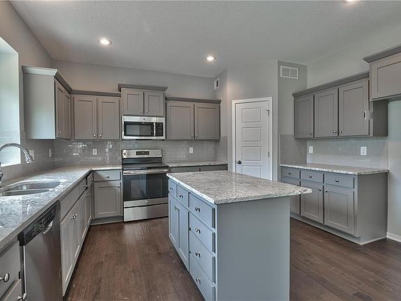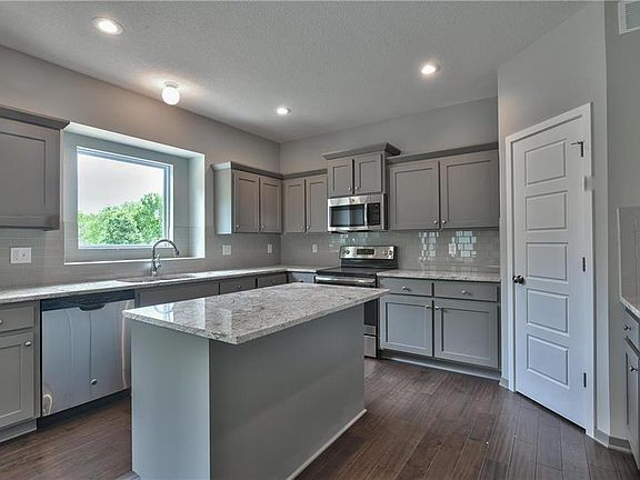 New construction Prieb Home, Greenview II Plan. Two-story entry leads to an open great room, kitchen and breakfast area. A floor-to-ceiling stone fireplace kitchen includes a center island, large walk-in pantry, custom cabinets w upgraded counter tops. Laundry room is upstairs near built-in custom bookshelves in hallway. Double doors lead to master bedroom, oversized tub, tiled shower with seat and walk in closet. Mud room, with a boot bench, can be accessed either through the front entry or the garage. Neighborhood placed between 2 parks & walking distance to new Olathe West High School. Home backs trees. NEW Lake Olathe just down the street. Photos are of a finished home.