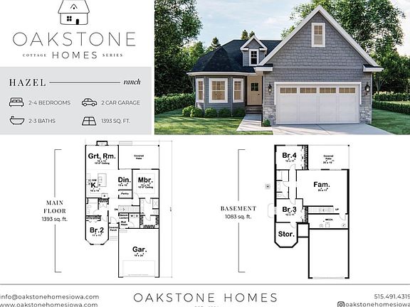 Oakstone Homes brings you the Hazel plan. This home features 1393 square feet on the main level with 2 bedrooms, 2 bathrooms, 10-foot ceilings, soft-close cabinetry in the kitchen, and quartz countertops throughout. The basement features an additional two bedrooms and a full bathroom along with an additional family room space. All information obtained from Seller and public records.