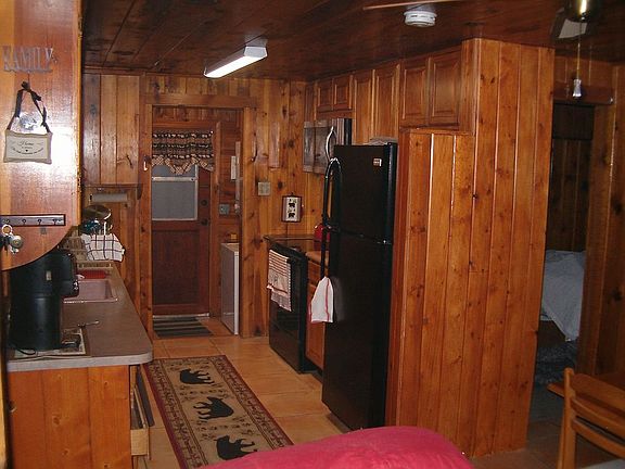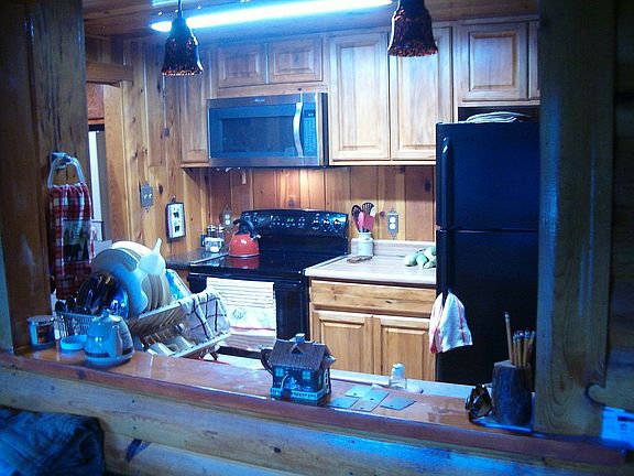 Charming wood log side cabin in fantastic location overlooking the meadow at Kohl's Ranch. Kitchen extensively upgraded in 2017 with added cabinets and storage, washer/dryer combo, all electric home. Enjoy the sound of Tonto Creek while relaxing under your apple tree on the flagstone terraces. Property is 3 lots on a corner backing up to national forest with communal green space/meadow in the front and has additional parking in the rear. Electric heat plus a wood burning fireplace keeps it cosy in winter while evaporative cooling chills the cabin down on the few days when cooling is needed.