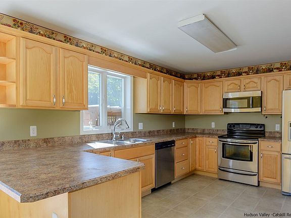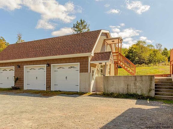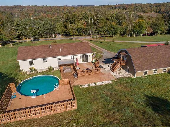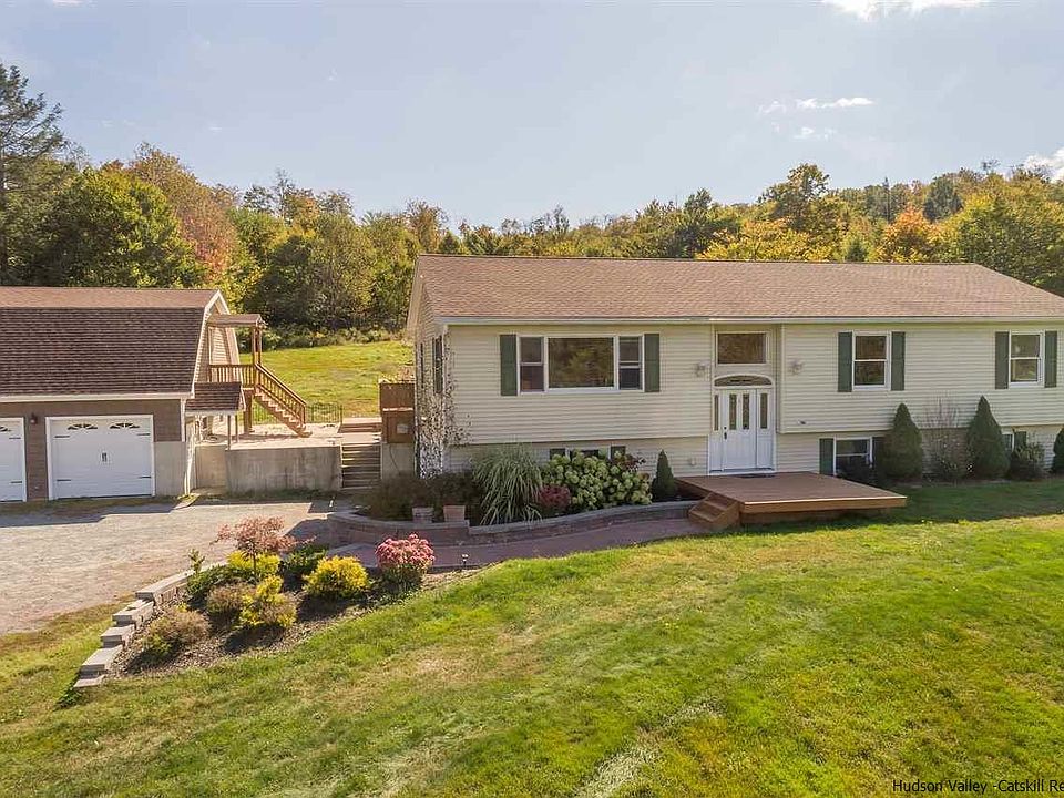 Nicely set back from the road on a knoll this 2007 built 3/4 bedroom 2.5 bath raised ranch in Tri Valley school district has a lot to offer. An open floor plan with the living room, dining room and kitchen opening to the backyard with its extensive decking that incorporates a hot tub and above ground pool for plenty of summer entertaining and fun.There is a master bed/bath and 2 additional bedrooms and full bath on first floor. The lower level has a family room and half bath that leads to a two car garage. A separate detached 3 car garage with full walk-up 1200 square foot area overhead that could be finished off for a studio/workshop or guest room for overflow company. There's also a metal carport and shed. All on a lovely 3.3 acres.