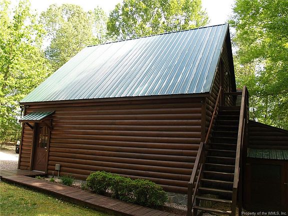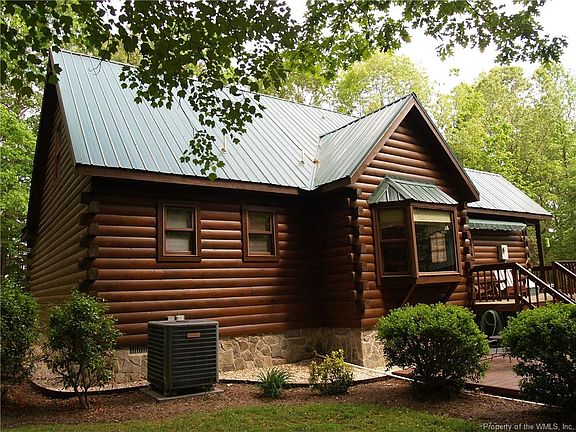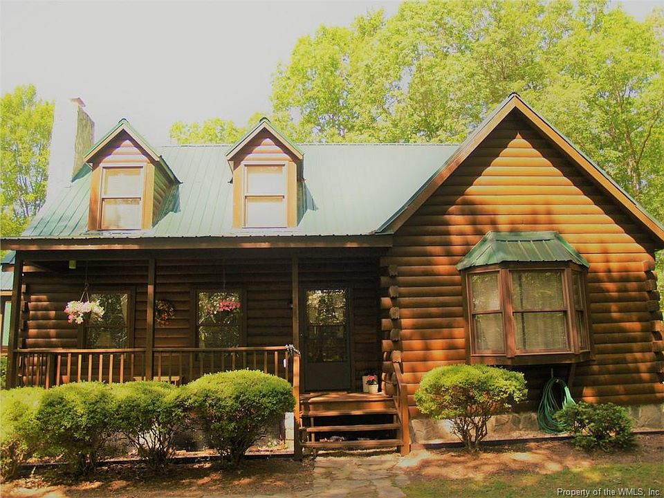 Classic custom built high quality log home on wooded 3.77 acre site. First level master bedroom, stone wood burning fireplace in living room, new kitchen appliances in late 2018, front porch and 2 level rear deck (retractable awning over upper level). Standing seam metal roof and HP/CA unit approx. 10 years old. Propane Generac generator powers home, except for kitchen range. (gas grill propane line at deck). Detached 2 car garage of similar finishes as dwelling, with partially finished 2 room second level, plus large side and rear shed/shop additions (3 rooms). Additional 1 car detached car shed located behind garage. 4" bore deep well located to the front of driveway circle. Septic to side/rear. Located off US 60 on Carriage Rd (Rt. 629, approximately halfway between Richmond and Williamsburg accessed by former forest fire trail now known as Bailey Rd.