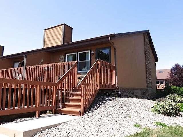 Located on the very end of Cheyenne Ct and facing south, you'll enjoy the views of trees and grass from your front porch. Multi-level unit has short stair runs up to a skylighted loft & master suite, or down to the 2nd BR, 2nd full BA, and laundry (tucked away in its own large closet). Storage space in the bsmt & back end of the attached garage. New efficient windows, new wood laminate floor & carpet (2013), new water heater, newer furnace & C/A. Only 6 units in the building & association. Pets allowed!