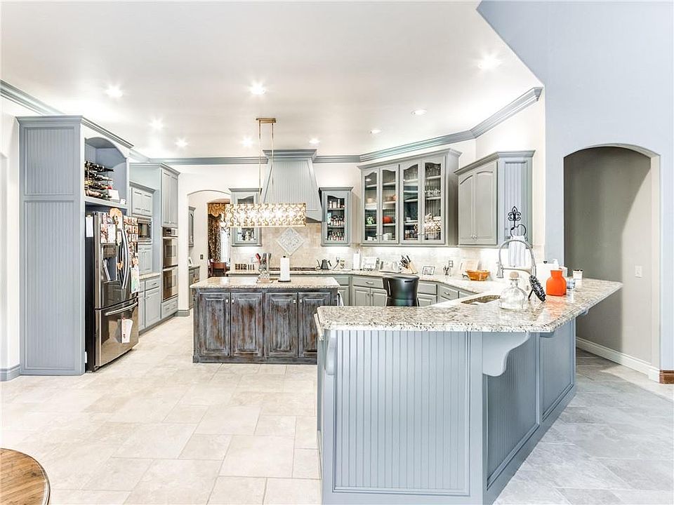A beautiful home in Hunters Creek with a shady backyard oasis, that has an incredible water feature with two waterfalls and a Koi pond. In the back is also two covered patios, a covered deck and a fireplace. Master bedroom has an ensuite bath with double vanity, whirlpool tub, large shower, and a huge walk/in closet. There is a guest suite with a bath downstairs, while the upstairs has another bedroom and a theater room. This home offers two large living areas and two dining areas downstairs allowing for great entertaining with a roomy kitchen and large island. Edmond schools and great community with ease of access to all things Edmond. 4 BED!! 4.5 BATH!!
