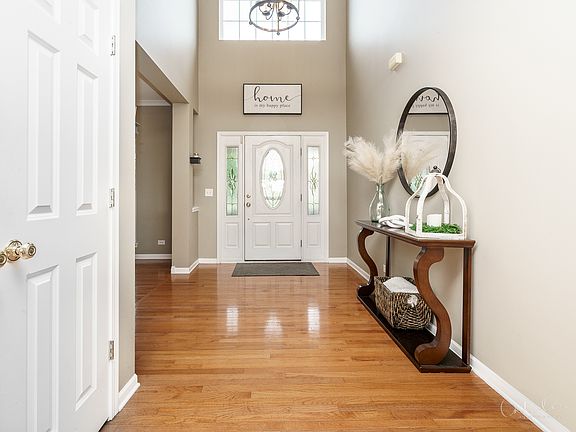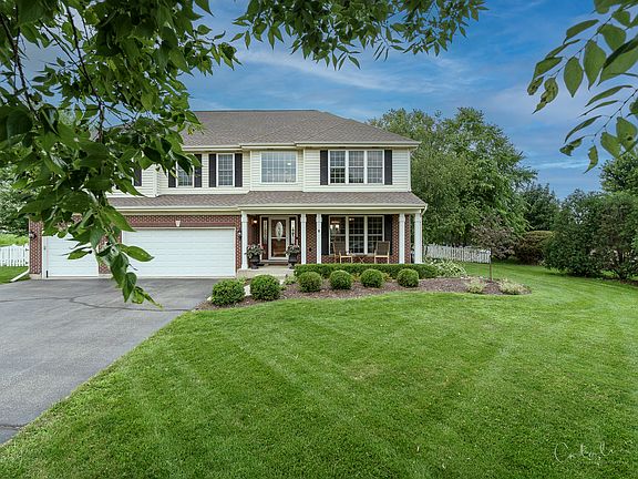 This home sits in a premium location on an oversized lot that is all fenced in. As you approach, you'll notice the covered front porch and nice curb appeal. When you enter the 2-story foyer you'll be taken back the light and bright open floor plan, gleaming hardwood floors, and custom details such as the crown moldings, custom/updated lighting and designer paint colors. Formal living and dining room areas offer much flexibility when entertaining guests along with the flow to the kitchen and family room. Island Kichen has been updated with high end appliances, quartz countertops, tile backsplash, and recessed lighting. Opening to your screened in and vaulted porch, you'll enjoy beautiful backyard sunset views, paver patio, firepit and hot tub. Off the kitchen is the large 2-story family room with floor to ceiling windows, more gorgeous views, and gas log fireplace. Main floor also boasts a den or 5th bedroom, and large laundry/mud room. Upstairs has all 4 very large bedrooms. The luxury master suite is vaulted, has his & hers walk-in closets with custom lighting and built-in organization. A private master bath has new quartz counters with dual sinks, corner soaker tub and separate shower. All bedrooms have ceiling fans custom closet organizations. Plenty of additional space in your full finished basement. Basement has large recreation area, bar area, full bathroom, exercise room, and several extra closets and storage areas. Spacious and heated 3 car garage. Close to all Huntley District 158 schools, and all area amenities.