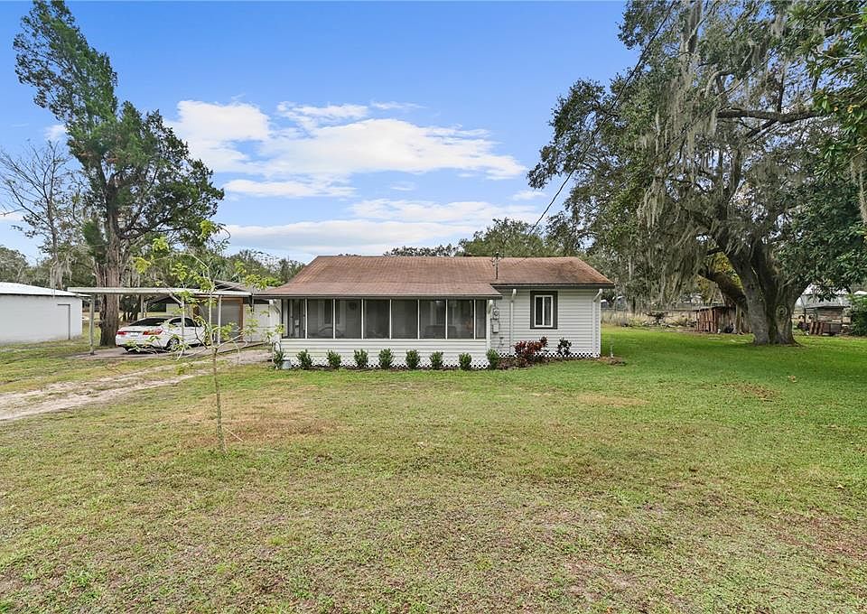 A rare find! A fantastically charming 2/1 sitting on a sprawling .85 acres right in the heart of historic Kathleen. NO HOA! This home has so much to offer, with an extensive remodel completed in 2019 including NEW WINDOWS, cabinets, countertops, appliances, light fixtures, water heater, and more! New laminate wood flooring installed in 2021. Perhaps one of the best features of this home is the huge front porch, fully screened and ready to enjoy indoor/outdoor living in the beautiful Florida weather! When you enter the home from the porch you enter the spacious living area, offering endless possibilities of layout and design. Just off the living area is the fully updated kitchen with tons of cabinet and counter space. The kitchen gets tons of NATURAL LIGHT, paired with the gorgeous white and grey design choices, this kitchen is a great place to be! Just off the kitchen is a great dining area and door leading to the covered back porch. The laundry closet is also conveniently located near the kitchen and dining area. The bathroom and both bedrooms are located with easy access from both the kitchen and living area. The bathroom has been very nicely updated to match the design of the kitchen, the vanity cabinet and wall shelving makes the best of the space to offer great storage. Both the bedrooms offer great space and have large windows that let in lots of natural light. Outside you have a covered back porch and the back yard of your dreams! The property is more narrow and deep so the back yard sits back far off the road, the space has so many possibilities! The workshop is comprised of two separate rooms featuring several exterior doors as well as a recently added roll up door in the front, a full size single carport is also attached to the front of the shop. This home is a rare find with this kind of land and a beautifully remodeled home, call to schedule your showing today!