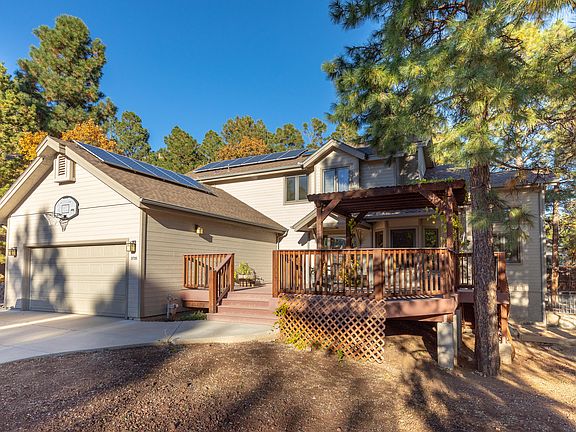 Welcome to a beautiful Skyline Estates home on a quiet, tree-lined cul-de-sac, close to the base of Mount Elden. The front deck feels almost like a magic garden. Inside, enjoy a large open great room with a brick fireplace, beautiful natural light streaming through wood framed windows, cathedral ceilings, and a separate dining area that feels like a special sun room. The spacious master suite is on the main level - perfect. With two bedrooms and a bath upstairs, a tiered yard with space for outdoor living and gardening, this is a fabulous primary or second home. Enjoy the added efficiency of solar ! Installed in 2015 and connected to the APS grid, your bills are about $20 a month ($60 in coldest months). Solid construction, private, quiet location, gorgeous trex deck, close to nature