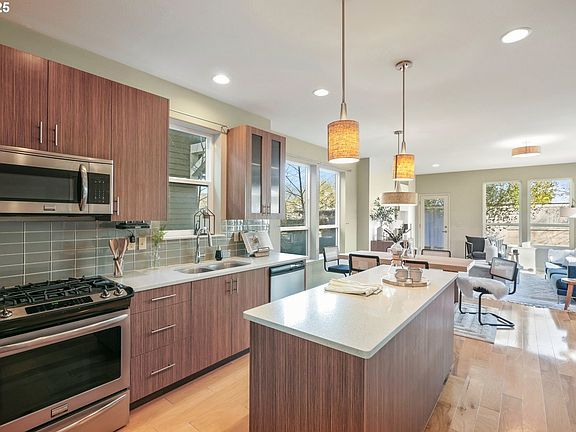 Flooded with natural light, packed with high-end upgrades, and completely move-in ready, this stunning contemporary home is a true standout. With an open-concept design, soaring 9’ ceilings, and expansive windows, every space feels bright, airy, and welcoming. The heart of the home is the beautifully upgraded kitchen, featuring quartz countertops, a sleek tiled backsplash, and stainless steel appliances, all seamlessly flowing into the dining and living areas. A plasma gas fireplace and wall-mounted media stand in the living room create a warm and inviting ambiance, making the space perfect for both entertaining and everyday comfort. Upstairs, the luxurious primary suite offers a peaceful retreat with double closets and a spacious ensuite bathroom. Two additional bedrooms provide flexibility, while a conveniently located utility room adds extra storage and functionality. Step outside through direct access from the living room to a private patio and fenced yard—ideal for morning coffee, evening relaxation, or entertaining. With its thoughtfully designed open floor plan, premium finishes, and an abundance of natural light, this home is ready for you to move in and enjoy! [Home Energy Score = 8. HES Report at https://rpt.greenbuildingregistry.com/hes/OR10236637]