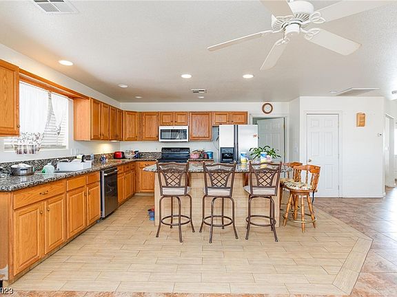 A Desert Oasis! Almost 2,100 sqft of living space sitting on almost 50,000 sqft lot. Open concept floor plan boasts 3 large bedrooms, a den, tile floors & granite counters. Cross-fenced back yard with lots of trees, storage, covered back patio and an outdoor kitchen. Lots of potential, let your imagination run wild! Centrally located in Pahrump this is a great location for a Vegas commuter that wants space inside and out.