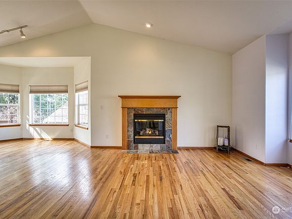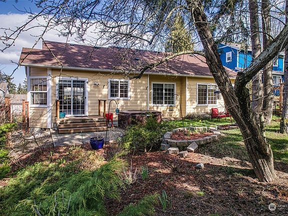 Sunny & Stairless modern home in quiet Bellingham neighborhood waits for happy new owners. From the real hardwood floors to the vaulted ceilings, a very low-maintenance home and property. Greatroom features fully-applianced kitchen and dining space w/ west-facing windows; adjacent living room has gas fireplace for seasonal comfort. Office has French doors and a view of the gardens. Primary suite features his & hers closets and full bath. Usable heated garage is great for projects with individual overhead doors. Delightful, private south-facing backyard with terraces and patio + hot tub for soaking under the stars. Fully-fenced lot with raised beds, mature plantings and great exposure in a walkable low-traffic neighborhood.