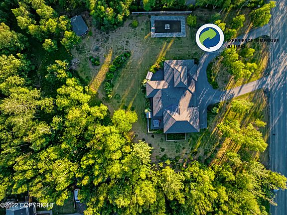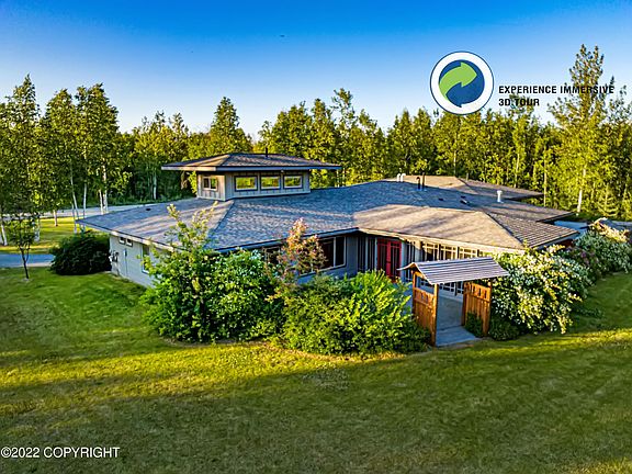 Absolutely stunning and unique, Frank Lloyd Wright inspired home plus an awe-inspiring observation lookout. The custom designed estate draws the outside in with the masterfully designed arrangement of the interior space to the exterior features. From nearly every window in this home you have garden views. There are lilacs, mock orange, berry producing shrubbery, roses, lilies, and so much more!The massive space next to the garage could be converted to bedrooms (or use it as a huge bedroom), an in-law suite, media room, game room or used as the owners did-a workshop. This home has a 4-bedroom rated septic system (as rated when constructed) BUT currently there are two bedrooms in the home and a library with room for additional bedrooms in the shop/bonus room. The large room near the hot tub was used as a garden room and that is where the homeowners started and cultivated the plantings in the yard and for the home. It was filled with lovely plants, and, in the winter, they still had their lush botanical sanctuary. Notice the drain in the floor? That is also purposefully placed for the seedlings and trees (really-a full sized Ficus tree lived in this room). The custom spiral staircase is from York and when this home was built in 2009 it cost $12,000 without installation or shipping from Maine. If you notice most spiral stairs are built around a center post not this one. York is known for the double helix design with two handrails, more usable tread space in a more comfortable safe and practical stare. The staircase was shipped from Maine to Alaska all fully assembled. Imagine what that looked like! For more information go to www.yorkspiralstair.com Come on up the stairs to the observatory. There are plenty of window to watch the birds, the northern lights or just bring a pillow and have your own hideaway! There is extra storage under the built-in platform too. This room is 18 ft by 8 ft. There's a niche at the top of the stairs you might not notice. When you go up the spiral, be sure to look at it. You will also notice all the concrete and exposed aggregate concrete around the home, the patio, and the walkway. This was also specifically designed and had been reinforced or thickened. It is in beautiful shape! Serviceberries (pick when dark color for sweet fruit) and Haskap berries (a part of the Honeysuckle family-pick when you notice the Robins gathering or they will steal them all) are both planted amongst the other beautiful landscaping. The covered sunroom is its own private oasis. Patterned to allow the gentle breezes through but to also be a protected from the weather, this is one of the best sitting areas to enjoy nature in a nearly mosquito free zone. No snow, no rain, perhaps a gentle breeze and the natural perfume of all the well established gardens resounds in a calming environment to simply relax. All of those gardens? Most are self maintaining or require very low maintenance. The roses are knockout roses and thrive when cut back (they come back more thick and strong). The lilac row? Imagine the smell (they are different types of lilacs and have unique scents to each) as you wander about the grounds when they are blooming. The added garage in the rear yard has a concrete floor and a roll up garage door. Although it was used for large yard equipment and not heated, it could hold a vehicle if you choose. The covered 1/2 carport is also to help keep equipment and wood (there was a firepit at one time) out of the weather. Extra storage is always welcome in Alaska! There is not another home like this one! It is custom and distinctive. It simply exudes both elegance and your own private garden sanctuary. $100 HOA fee ONE TIME ONLY with each sale of the property.