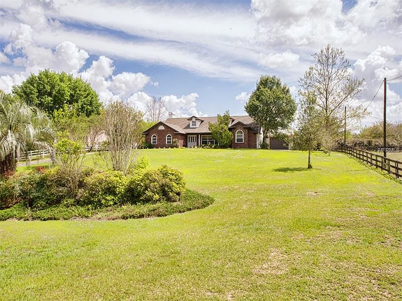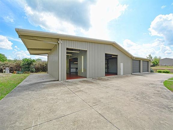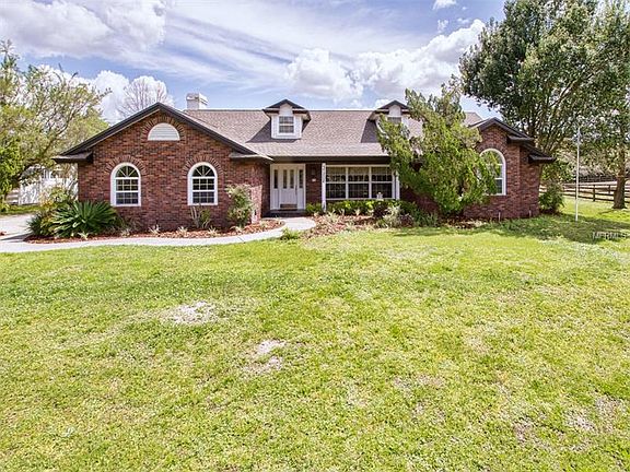 4 BR BRICK HOME ON ACRE + WITH 3600 SF STEEL WORKSHOP--Located in beautiful rural Eustis, yet approximately just 7 miles to both downtown Eustis and Mt. Dora. 2,645 SF attractive brick home with gabled roof and front porch offers a 1.21 acre yard with the house set back affording privacy and lovely views. Attached is a 3 car garage with a long driveway and huge parking pad adjoining the ultimate man-space! The Butler Steel Building Workshop consists of a huge covered carport, a climate controlled section with a 13x39 RV bay with power and 13 FT roll-up door. 12 FT. roll-up door with 36x39 workshop. In addition is a 39x41 storage bay with an 11 FT roll-up door. Perfect for a boat or car collector! The home has a wonderful split plan with neutral color palette, tile, carpet and 'wood' laminate flooring, 16 FT. volume ceilings, plant shelves, wheelchair accessible doors and hallways. Spacious living room opens to dining room with French doors to lanai. Gourmet kitchen is outfitted with richly stained wood cabinets, granite counters, stainless appliances, gas stove, island, built-in desk and pantry system. Great for entertaining, the kitchen flows into a cozy family room with stacked stone fireplace. 16x17 master suite with doors to lanai, 2 walk-in closets and private bath with 2 sink vanities, garden tub and separate shower. 3 additional bedrooms, full bath with dual sinks and tub/shower, plus a laundry room with sink/storage. 14x30 covered, tiled and screened lanai for outdoor living. Welcome Home.