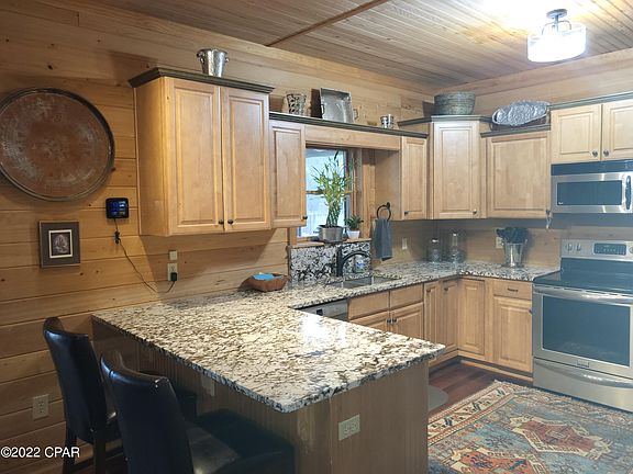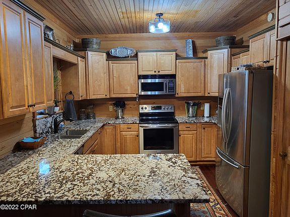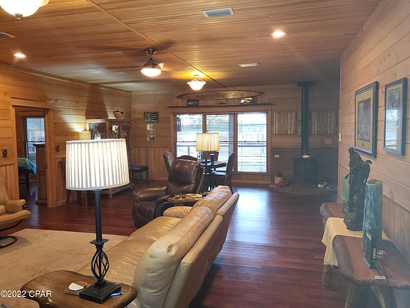Open House Sunday February 4th 11am-2pm BEAUTIFUL Waterfront Deer Point Lake home. All wood interior: Brazilian Cherry, Knotty Pine with solid Birch cabinetry. Over 2000 sq foot of rustic elegance. No drywall, custom built by a master carpenter. Master bedroom suite has lakeview & French doors that open to screened in porch & a bathroom fit for Royalty Double paned insulated 6' windows, new Bauch dishwasher (kitchen renovated in 2019). Huge open living, dinning, bar and kitchen area for entertaining. Copper colored metal roof, whole House Generator, RV Barn, 4 Bay pole Barn, (4 storage out buildings in all). Property extends to include half of the freshwater lake with T Dock and boat slip with elevated viewing deck above boat slip. I/2 Gulf Access ramp