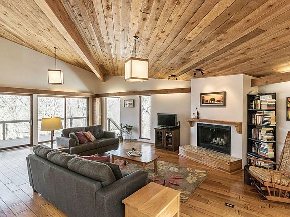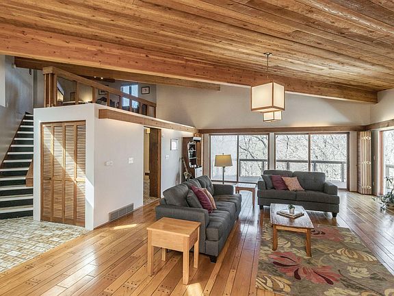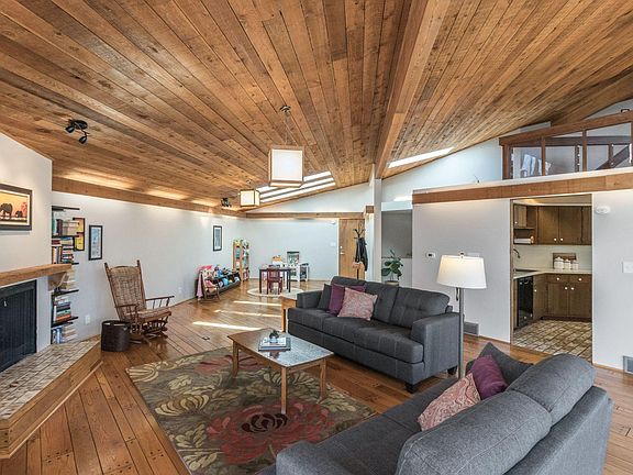 2,813 sq.ft of finished space in this unique one-of-a-kind home. Wooded lot backs up to Munn Woods. Large part fenced off in the private back yard. The large great room has a vaulted ceiling, skylights and wood burning fireplace. Enjoy the beautiful vista through the floor to ceiling windows or step out to the deck. The kitchen has access to an open patio. Private loft area is an ideal flex space. Walk-out lower level has 3 bedrooms, polished concrete floors and 2 remodeled baths with heated floors. Large 2 car garage with extra built in storage.