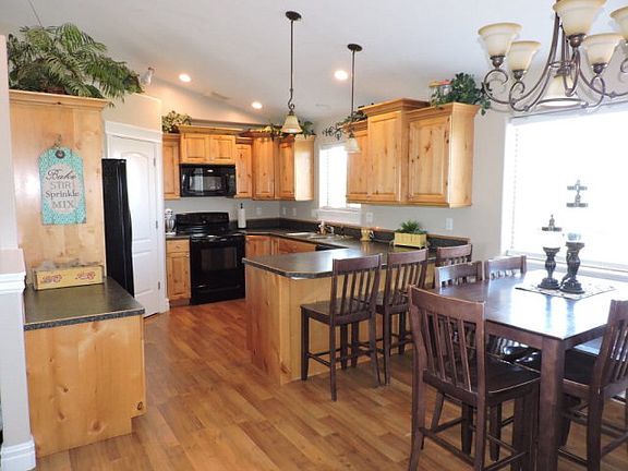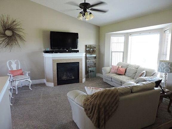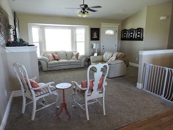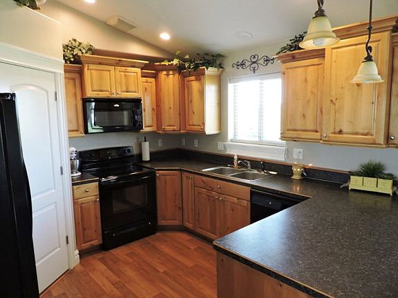 Beautifully landscaped home sits in nice subdivision near schools. The main floor features beautiful kitchen with lots of alder cabinets, corner pantry, and all appliances. Off of the kitchen is the large laundry room with built in cabinets. The main floor master bedroom has walk in closet, trayed ceiling, and master bath with jetted tub, double sinks, separate shower, and separate toilet area. The other 2 main floor bedrooms are spacious. The walk out basement is a great place to entertain with a beautiful gas fireplace, wired for surround sound for a theater room, and a second full kitchen. There are 2 more bedrooms and a full bath in the basement. The big beautiful back yard is landscaped with flower beds, garden area, in ground trampoline, and nice deck and patio with fire pit. Front yard is beautifully landscaped with circular drive way.