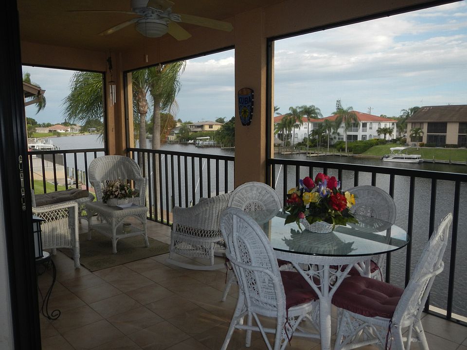 Beautiful, private second floor corner 2BR/2 Bath condo. Tiled living room and dining room with cathedral ceiling. Impact windows and sliding glass doors. The unit is located in the desirable SE area of the Cape close to downtown and just one bridge away from the Caloosahachee River with a southwest exposure to enjoy awesome sunsets and overlooking the 200' wide Rubicon canal. If you love the fresh air and outdoor feeling, imagine waking up in the morning feeling the warm breezes come through the screened in area into your Master Bedroom, then stepping out having your coffee out on the lanai overlooking the canal.