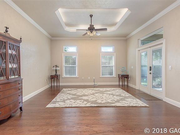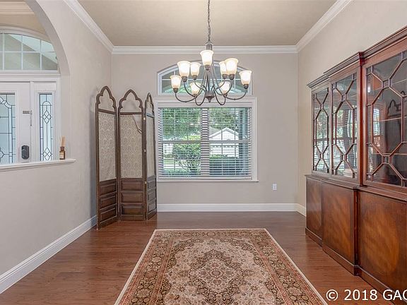 Move right into this beautifully maintained 4 bedroom/3 full bath former Parade home featuring an open, flowing 3-way split bedroom plan, which has a formal living room with fireplace, formal dining room, and spacious family room. The roomy kitchen includes 42" wood cabinets, granite countertops, stainless steel appliances, a center prep' island, breakfast bar, pantry room, and adjoining breakfast room. The generously-sized master suite has his and her walk-in closets and a large master bath with two separate vanities, separate shower and soaking tub, together with an adjoining nursery/exercise room. Architectural finishes include 10 foot & double trey ceilings, wood floors and tile, transom windows, french doors, arched interior doorways and crown molding. The home includes a breezy screened porch that overlooks a well landscaped, privacy-fenced backyard w/large oak trees. Located in the community of Garrison Way, the home also has a two-car garage w/custom cabinets and is just steps away from the community pool and Kanapaha Park, and within an easy 10-minute drive to the University of Florida and Shands areas.