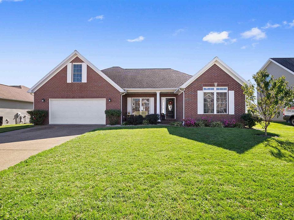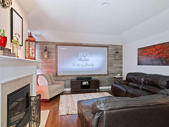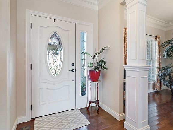 Beautiful 3-4 Bedroom1.5 Story Parade Home by Eagle in Creekside Meadows! This lovely home has a wonderful backyard with no neighbors behind, split bedroom floor plan, Bonus Room has a closet and can be a 4th Bedroom, attractive hardwood flooring, crown molding, columns, custommaster bath, and an abundance of large windows! Off the foyer is a Dining Room that could serve as an Office. The entry greets you with a 9 ft foyer ceiling with Triple crown molding. The spacious Great Room has a gas fireplace, top of the line projector and fabulous wall screen, and is open to the Kitchen/Dining Area.The Kitchen hascappuccino castled cherry cabinetry with large crown with a dentil, pantry, servingbar, and the dining area has great views of the backyard, door to the patio, and plenty of light coming in! The spacious Master Suite has a large walk-in closet, custom private Bath with a granite surrounded whirlpool tub, separate shower, double sinks, and built-in cabinetry. Bedrooms 2 and 3 are on the opposite side of the home, along with the Hall Bath. The Bonus Room would be an ideal 4th BR, additional living area, or get-away. The Laundry Room leads to the 2.5 Car Attached Garage and has shelves, cabinets, and ceramic tile flooring. You will enjoy relaxing on the large patio in the fabulous privacy fenced back yard, and there is a cute brick firepit area toward the back complete with poles for hammocks! The pool with equipment and shed are also included! Seller will provide a $950 allowance for flooring in the Master BR. Sale includes: all Blinds, Range/Oven, Dishwasher, Microwave, Projector and Equipment, Firepit, Hammock Poles, Shed. Excludes: Freezer and Fridge in Garage, and fireplace screen.