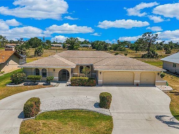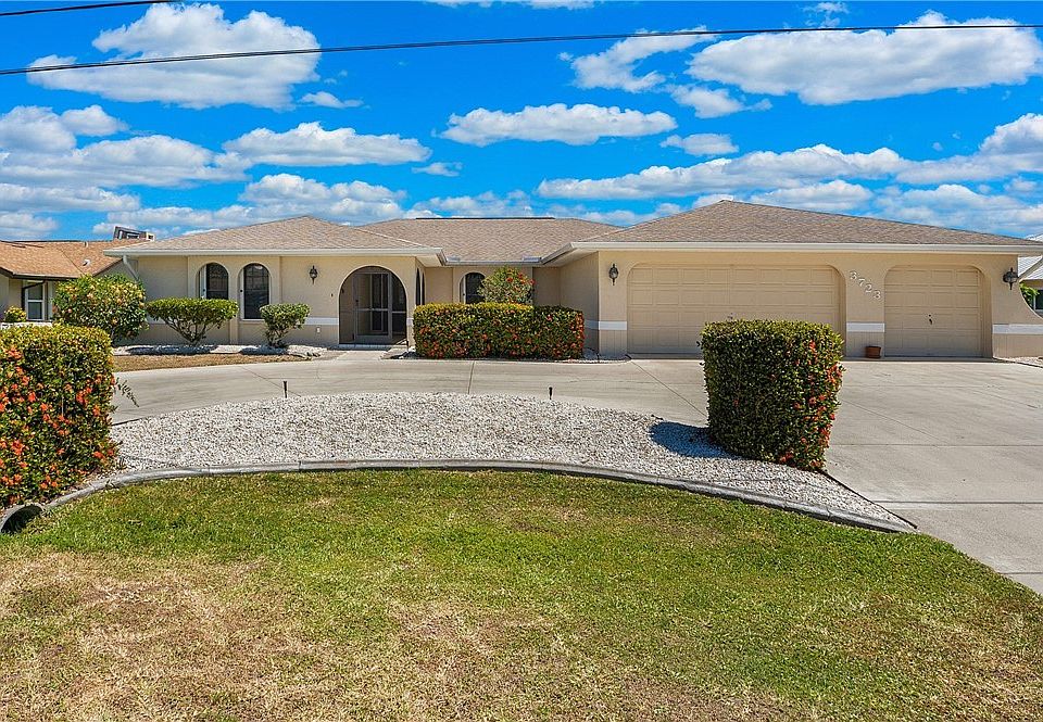 Beautiful 3 bed, 3 bath, 3-car garage Pool home on OVERSIZED LOT in very desirable neighborhood in SE Cape Coral!! Nearly 2,500 square feet of conditioned space! This home is well maintained and ready to move in. Curb appeal is impressive showcasing mature landscape and circular driveway. NEW AC in 2021. Newer roof in 2016 and no Ian damage. Also, NO IAN FLOODING!! Enjoy your morning coffee on the back covered lanai overlooking your beautiful pool/spa and into the most amazing sunrises Cape Coral has to offer. Pool interior recently reshot. Kitchen remodel boasts newer cabinets, granite counter tops and island, stainless steel appliances, tray ceiling and recessed lighting. Kitchen passthrough window is perfect for entertaining guests out on the large lanai with built in granite high top. Main bath shower recently redone with floor to ceiling tile. Three sets of POCKETING sliders. This home offers TWO pool baths. One access to the main bath. The second pool bath access is from the outside under the lanai and includes a tile shower! Massive laundry room with utility sink and room for storage. Washer and dryer DO convey. This unique pool home will not last long. Take advantage now!