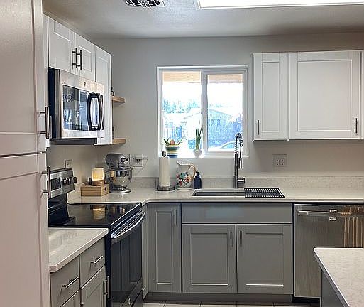 Newly remodeled house in quiet subdivision. This 3 bedroom 2 bathroom home is move in ready! Home has new paint and tile flooring throughout. The beautiful kitchen is updated and perfect for entertaining family and friends. Utilize the nice built in coffee bar to create the perfect latte or tea. The newly added central air will keep you cool all summer long or enjoy that latte outside on your covered patio, just off the dining room. It’s great for a relaxing night by the fire too. It has an installed misting system to keep you cool in the heat of the summer. The main bath and en-suite have both been remodeled. The new siding and new windows add to the updated features of this home. The roof is new spring of 2022. The backyard houses a kids play area, grill area, vegetable garden and a utility shed. The attached two stall garage boasts a mud room area as well as a built in work space with plenty of room for two cars to park. New plumbing and electrical work in the kitchen and both bathrooms. The lawn in front and back have underground sprinklers and the raised garden beds have an installed drip line. New siding, windows, gutters, soffit and fascia in summer of 2021. New roof March of 2022. Come see your future home today.