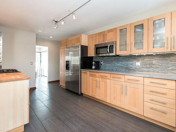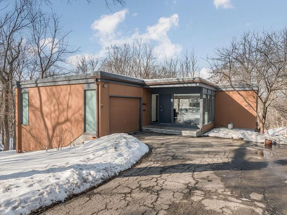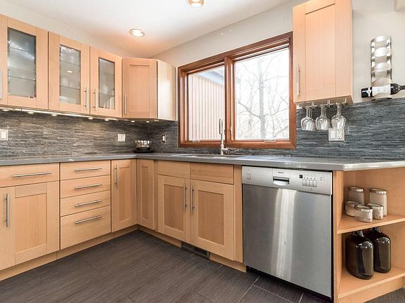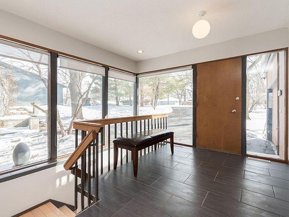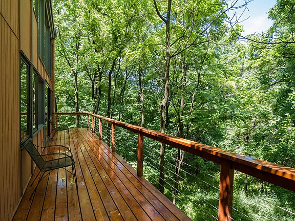 Modern Living with Four-Season Views of Preserved Woodland. Spectacular architect designed, completely remodeled mid-century home on nature retreat. Floating atop tens of acres of Munn Woods unspoiled wilderness, the home is a 10-minute walk to ISU campus. The house high elevation & floor to ceiling windows overlook a treetop view into the horizon. Fully updated open kitchen with bar seating opens to the woods. The kitchen features IKEA birch cabinets, Silestone counter tops, butcher block, stone & metal tile backsplash, track lights, ceramic tile. Two master bedrooms with Zen modern bathrooms feature a rock sink, granite vessel sink, pebble shower floor, ceramic tile and cork floors. A third bedroom with own bath opens to family room, dry bar, office and a cedar/steel wire suspended deck