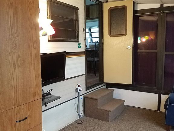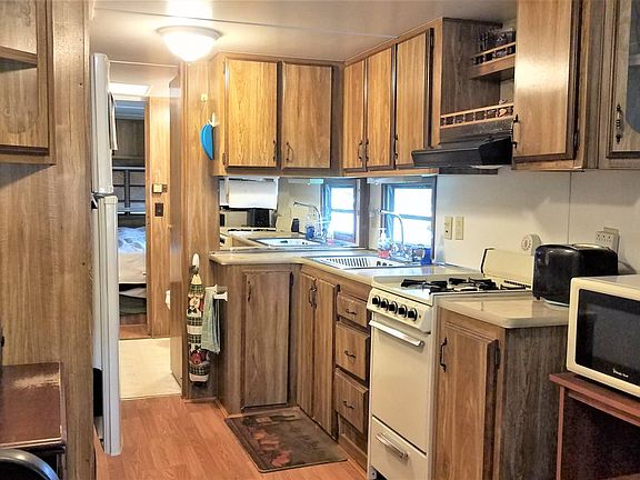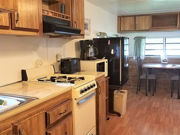 Located on leased land in 55+ community. 1 Bed, 1 Bath fully furnished home on beautifully landscaped great corner lot. Florida Room with vinyl windows, screens, carpet, window A/C units and extra bed. Main home has newer laminate throughout and LOTS of great storage, roomy bedroom with even more built-ins, newer water heater, Roof-Air, and a kitchen with a gas stove, full size refrigerator, and an extra small fridge. Extras on this home are an AMS Roof-over on the main home, steel roof on the Florida Room, back covered patio, and extra outdoor shed. DON'T MISS THIS GREAT DEAL!