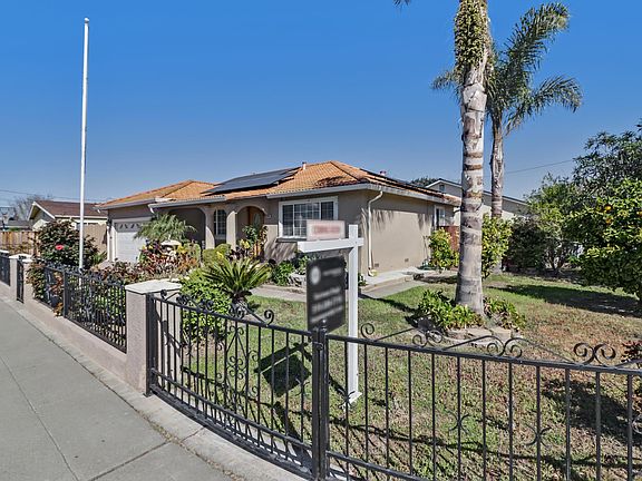 Motivated Seller will give a quick response to an offer on this amazing home with it's own grove of fruit trees! Fenced & gated front/side yard with Granny Smith apple, Apricot, Orange, Tangerine, Psidium Guajava, Lemon & 4 in 1- Apricot, Peach, Nectarine, Plum. Immaculate single family home on beautiful corner lot w/ solar power! Side yard access on both sides. Like new kitchen w/ some SS appliances. Laminate floors, dual pane windows, upgraded interior panel doors, ceiling fans in all bedrooms, crown molding throughout, central A/C. Nicely sized yard w/ large shed for additional storage. Upgraded stucco exterior & 50 year tile roof! Stamped concrete driveway & walkway. 2 car attached garage w/ insulated roll up garage door. Neat & tidy garage w/ tiled floors. Solar cut electric bill from $250 to $149 fixed rate per month! Centrally located at the foot of the Dumbarton Bridge, close to 880, Tesla & Facebook!