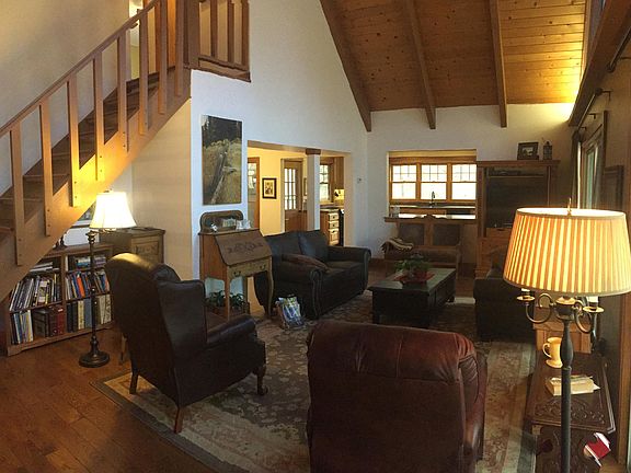 Very private, immaculately maintained, charming home on a gorgeous 5 acre parcel backing up to Fruit Growers land. Peaceful and quiet setting at the end of the road, yet only 4 min from town. Great renovations including custom kitchen cabinets, many Anderson windows, 3/4'' solid oak flooring, composite deck and newly remodeled bathrooms with tile surrounds. Large vaulted ceilings with open feel.
