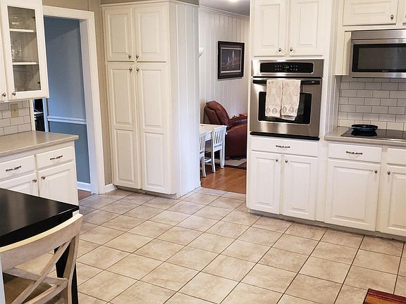 - Kitchen: Eat In, Counter Tops-Solid Surfac, Floors-Tile, Backsplash-Tiled, Cabinets-Painted, Recessed Lights