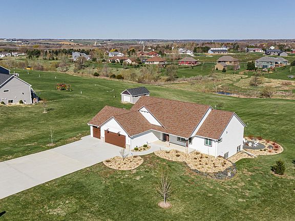 Custom built, zero entry walkout rambler with no steps in front or garage entrys. Wide doors and hallways, large bedrooms and located on over 2 acre lot! Gourmet kitchen with custom white cabinets, hard surface countertops, breakfast bar, wine and coffee bar with butcher block countertop. Spacious living room with gas fireplace and vaulted ceilings, master suite offers master bath with double sinks, granite countertops, large custom shower with dual showerheads, air tub, heated floor and walk-in closet. Main level laundry, oversized 3 car heated garage, deck, professionally landscaped with retaining walls, patio and firepit.