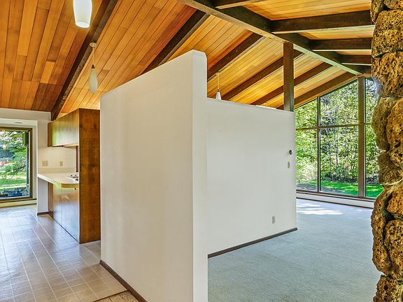 Classic 1963 Mid-Century Ranch. Architect Gordon Ruehl of the renowned Walker + McGough firm designed this home as his own for 53 years of enjoyment. Open concept with a cathedral ceiling spanning the kitchen, living room, dining and entry. Main level primary suite plus a large studio space across the hall with desks and cabinets capable of being converted back to two bedrooms. Two bedrooms upstairs plus a unique bathroom arrangement that includes one room with only a shower and the other room with a toilet and a sink. Family room off the kitchen/dining area plus a lower-level family room or possible additional bedroom with windows for natural light plus a laundry room. Hot water baseboard heat. Property shape is irregular with 21,385 SF providing for privacy and beautiful natural landscaping with massive rock formation and trees on the east side yard. This is a wonderful opportunity to update a large mid-century home on a quiet curved street walkable to Hamblen School. Priced 23% BELOW tax assessed value.