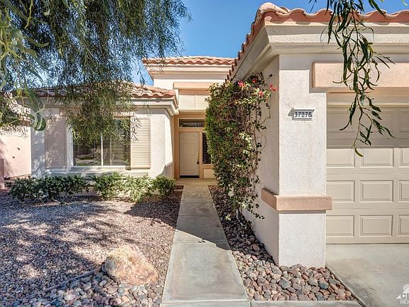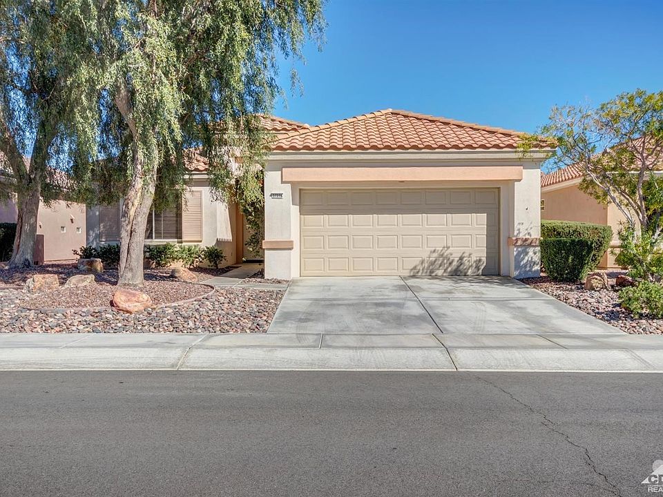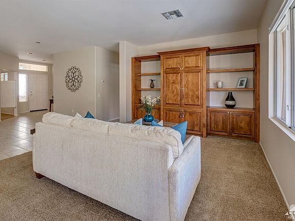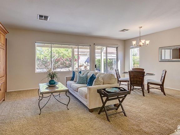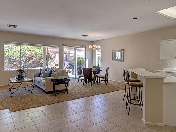 55+ Sun City Palm Desert. Very popular 2 bed/2 bath plus DEN St. Maarten model. Open concept light, bright and cheery. Nice curb appeal, quiet street, newer A/C, furnace, hot water heater. Newer fridge. Kitchen has glass block accent recipe windows, island with room for bar stools. Master bedroom has bay window with view to east facing patio, desk area, and walk in closet. Guest bath has soaking tub/shower. Patio is extended with aluma-wood awning, peaceful and private with water feature, great for entertaining, nice easy maintenance landscaping front and back. Garage has storage cabinets.