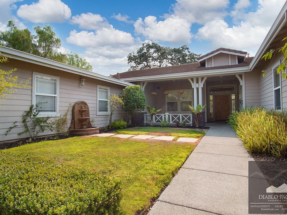 This special executive estate home is a must-see. Located on a quiet and secluded lane, this property is just steps away from the impressive Mt. Diablo Open Space. Situated on a flat acre, this estate was designed with privacy and weekend entertaining in mind. The four-bedroom, three-bath home features high ceilings throughout its open and airy floorplan. With a casually sophisticated ambiance, the home caters perfectly to today's modern, discerning family. Thoughtfully crafted with attention to every detail, it offers multiple spaces to entertain or retreat. A central living room, anchored by one of the home's three gas-burning fireplaces, connects to a formal dining area that flows seamlessly onto the patio. Multiple patio doors open to an expansive entertainer's patio that overlooks the beautifully manicured grounds and spacious lawn. On one side of the home, you'll find the eat-in kitchen with a central island, high-end appliances, a bright breakfast nook, and a cozy family room. The other side of the home is dedicated to the grand master suite, along with three additional bedrooms. The master suite features an inviting gas-burning fireplace, an en-suite bath with a full-size tub, a walk-in shower, and two separate walk-in closets. Each of the three additional bedrooms includes walk-in closets and private access to bathrooms. The grounds are exceptional and thoughtfully planned. The front landscape is both dramatic and welcoming, offering mature plantings that ensure privacy, along with a variety of fruit and nut trees. The serene backyard is highlighted by a spectacular heritage oak that creates a natural canopy over the lawn and patio areas. Ample private parking is available, along with an attached three-car garage. A separate laundry room is also included. Additionally, solar panels and electric are included, offering energy efficiency and modern convenience.