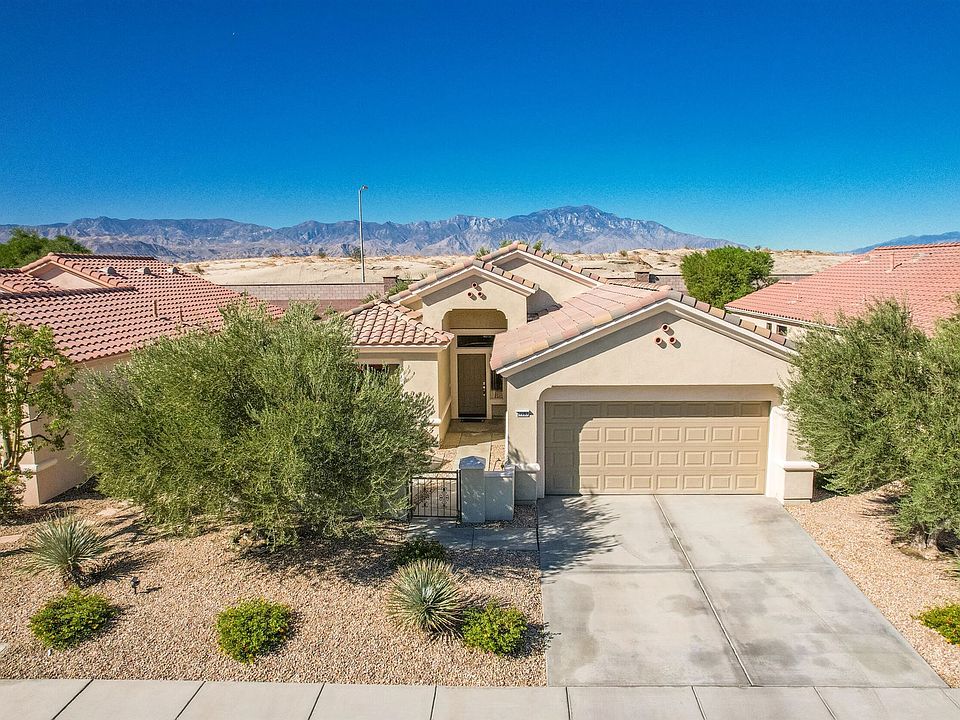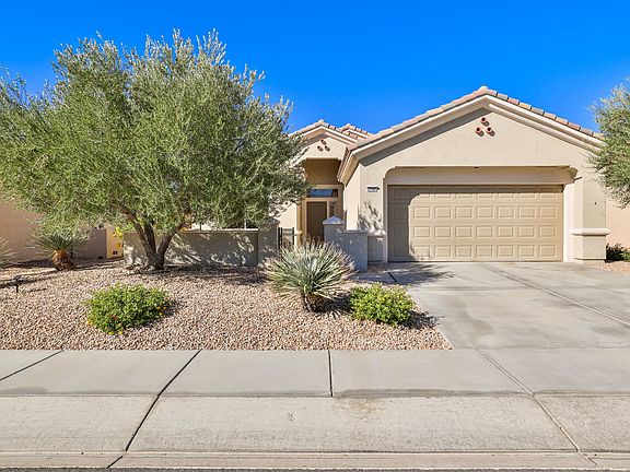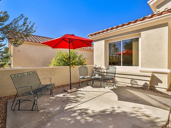 55+ Sun City Palm Desert. Very popular upgraded Great Room St. Maarten model with 2 bed./2 bath plus DEN. Brand NEW A/C unit in 2021 and hot water heater! Beautiful curb appeal with large courtyard with extended patio. Newer exterior paint. Inside, home is light and bright, tile in the living areas and carpet in the bedrooms and den. Kitchen has gorgeous quartz counters, maple cabinets with pull-out shelving, recipe windows. Living room and dining area are open concept with large windows and sliding doors to the patio. Master bedroom has bay window, nook for TV and desk, vertical blinds, large walk-in closet, bath has cultured marble double vanity, cabinet with roll-out shelves, (2) newer toilets. Guest bedroom is separated for extra privacy, vertical blinds, walk-in closet. Bath has white cabinets. Den/office is large and can be used an extra guest room. Laundry room is inside and has white cabinets. Washer and dryer are included. Backyard is spacious and very extended patio and super private. There is an Aluma-wood awning covering so you can relax and entertain, yard is terraced with flower beds and trees. Gorgeous olive trees in front and back adding nice, cool shade. Irrigation has been upgraded with 1/2 inch PVC pipe. Garage has work bench and (3) large cabinets/storage. Weep screed installed and most windows have new solar screens.
