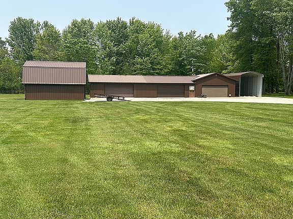 4 bedroom, office, kitchen, 2 living rooms, laundry, back deck, 2 car attached garage and large garages in back of house , with heat and AC , 4.47 acres , 1/2 acre pond