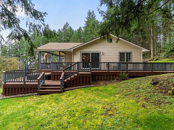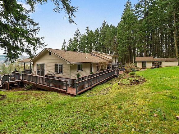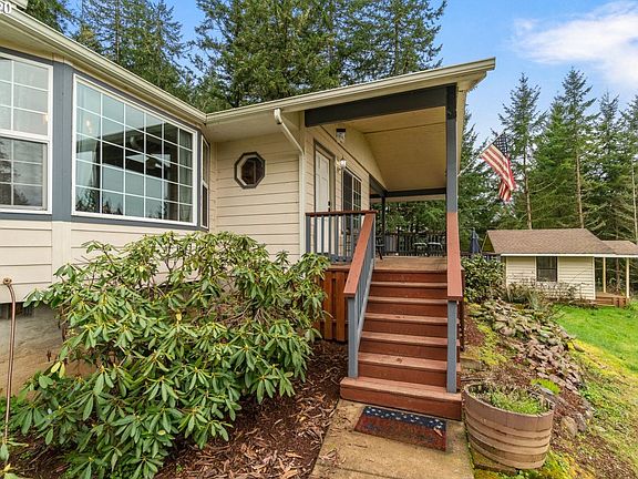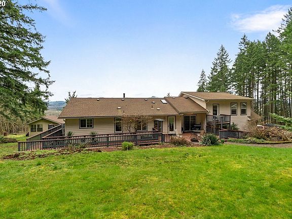 Home with beautiful views! Extra-large master suite, picture windows, walk-in closet, office. Open living area with vaulted ceilings, skylight and wood stove. Newer stainless appliances and flooring, eating bar, dining with bay window. Wrap around deck, covered front porch and newer hot tub. Paved driveway, 3 car garage, shed, shop, covered RV parking, barn, chicken coop on 5 acres and P-hill schools. 8 mins. from I-5. Don't miss out!