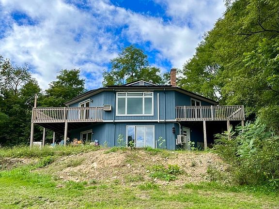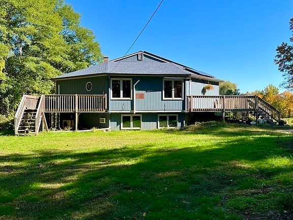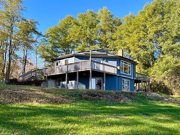 This octagonal house sits on 3.5+ idyllic acres shielded from Montague Rd by trees. Flexible bedrooms 3/1 or 2/2. The larger unit upstairs has 2 decks,,main BR en suite, eat in kitchen w.granite counters, new glass doored cabinets, newer dishwasher. Open layout flows to LR with wood stove and a beautiful view of large yard and and foliage through picture windows / glass doors to deck. Hookups for same floor laundry in closet off the kitchen or keep washer and dryer in basement. Lower unit has view of yard, patio, glass doors, 1-2 bedrooms, laundry room w. sink and toilet, separate bathroom to wash in. Both units vacant! Plenty of space for fruit trees and gardens. New roof installed in 2017 APO & 50k owned Solar Panel system 2017. Enjoy free electric for top unit plus SRECS. 4 new mini splits upstairs via Mass Save. New efficient hot water heat pump. New four bedroom septic system. Wonderful location in North Amherst. Bring your design ideas to make this unique property shine.