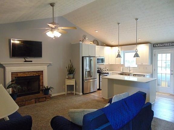 - Kitchen Features: Breakfast Bar, Eat-in Kitchen, View to Family Room, Kitchen Island, Solid Surface Counters, Cabinets White