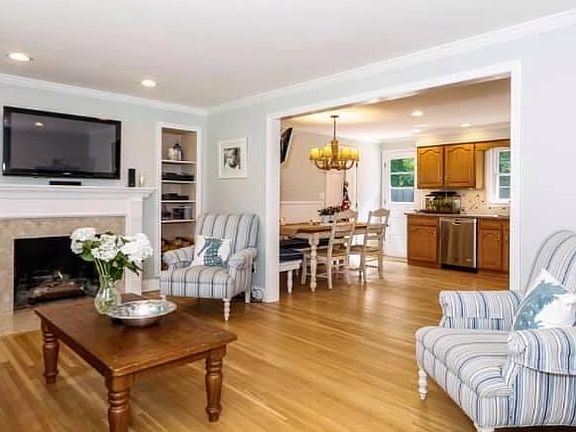 The perfect place to enjoy the beautiful nature on the lake all year long. Move-in-ready cape with a fully level fenced back yard! Tastefully finished with recessed lighting, crown molding, built in shelving and wood burning fireplace. Spacious eat-in kitchen with a built-in seating, center island, granite counters and newer stainless steel appliances and sliders. Fabulous deck overlooking the fenced yard runs the full length of the house. Sun-filled Office/Bedroom with recessed lighting, wainscoting and crown molding, dining room or playroom and a beautiful marble bath with jacuzzi tub complete the main level. On the upper level the master bedroom is light and bright and features hardwood floors and walk-in closet, a 2nd spacious bedroom and a full bath. Unfinished basement in addition to the space above the garage, offers fantastic storage space. Community association beach for neighborhood gatherings and summer fun! Not to be missed.